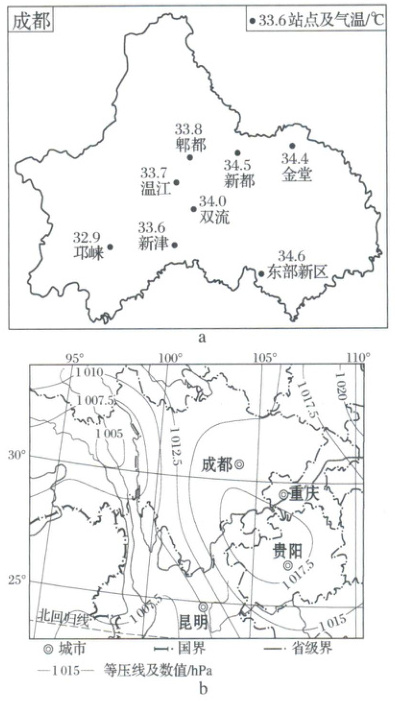 (2024·北京等级考)2024年成都世界园艺博览会于4月26日至10月28日举行。图a显示成都部分气象站点2023年4月—10月某日的最高气温,图b为北京时间2024年5月15日14时西南地区局部海平面气压分布图。读图,完成9~10题。
