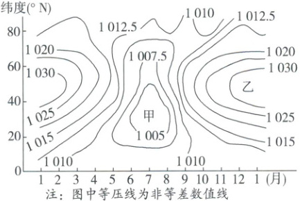 (2024·浙江6月选考)亚洲的天气、气候与气压场的分布及变化直接相关。下图为沿100°E海平面气压(单位:hPa)年变化图。完成5~6题。