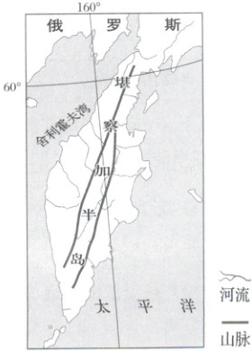 堪察加半岛位于俄罗斯远东地区,有两座沿半岛延伸的山脉,森林覆盖率大于 40%。半岛冬季降雪多,形成厚厚的雪层。夏秋季节受海洋吹来的夏季风影响,降水丰富。独有的地貌和气候影响半岛的河流分布。下图为堪察加半岛山脉与河流分布图。