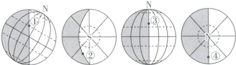 2. 图中四点所在晨昏线平面与太阳光线垂直的是 (