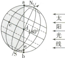 昼夜现象使地球表面出现晨昏线(圈),把地球分为昼半球和夜半球。读图(a、b、d、e在晨昏线上),完成3~4题。