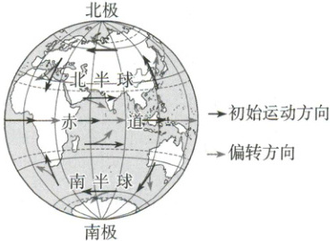 材料一 由于地球自转而产生的促使物体水平运动方向产生偏转的力,称为地转偏向力,公式为$F = 2v\omega\sin\varphi$(v为物体运动的速度,$\omega$为地球自转角速度,大约是$15^{\circ}/h$,$\varphi$为运动物体所在纬度)。下图为地球自转促使水平运动物体方向发生偏转示意图。
