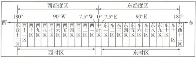 以东,依次划分为东一区至东十二区;在中时区以西,依次划分为西一区至西十二区。东十二区和西十二区各跨经度$7.5^{\circ}$,合为一个时区。(4)区时:各时区都以本时区$\underline{⑬}$