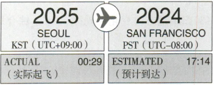 某飞机于2025年1月1日00:29从韩国首尔(东九区)起飞,最终在美国圣弗朗西斯科(旧金山)(西八区)降落。飞机降落时当地时间是2024年12月31日17:14。下图示意该航班详细信息。
