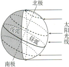 ④昼弧长度为0或夜弧所跨经度数为360°时是极夜;夜弧长度为0或昼弧所跨经度数为360°时是极昼(日出时间0:00,日落时间24:00,如图中北极圈及其以北地区)。