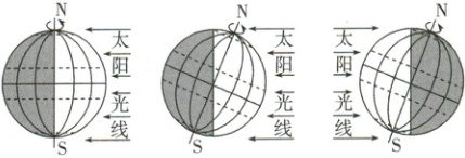 下面三幅图示意二分二至日昼夜长短的分布。