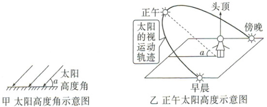 (1) 太阳高度:太阳光线与地平面的交角 (即太阳在当地的仰角),叫作太阳高度角,简称太阳高度 (如图甲所示)。