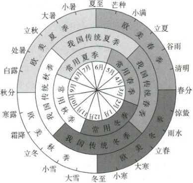 黄赤交角的存在导致地球在公转过程中产生了昼夜长短和正午太阳高度的时空变化,太阳辐射在一年中也呈现有规律的变化,形成了四季。我国分别以立春、立夏、立秋、立冬作为四季的开始。