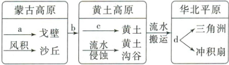 蒙古高原、黄土高原和华北平原三地的外力作用在成因上具有一定的联系。下图中各字母表示不同的主导外力作用类型。