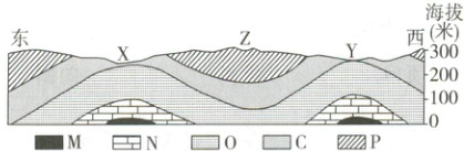 下图示意某地区地层剖面,M→N→O→C→P岩层年龄由老到新,M和O为不透水岩层。读图,完成1∼2题。