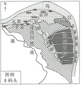 (2025·浙江台州高二期中)流坑村($115^{\circ}E$,$27^{\circ}N$)是一座古村落。下图为流坑古村功能区分布示意图。据此完成 3~4 题。