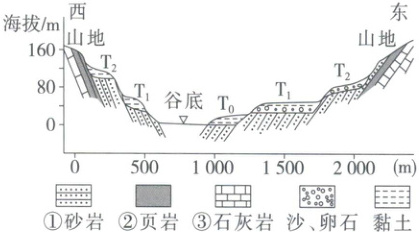 (1)顺序:T₂早于T₁,T₁早于T₀。依据:T₂阶地位置高,距河面远,形成时间早,T₀阶地位置低,距河最近,形成时间最晚,T₁居中。