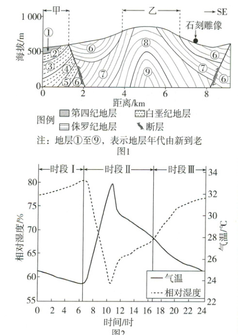 (1) 分析图1中甲、乙两区域地质构造和地层年代特征,并据此判断哪个区域遭受的地表剥蚀作用更强烈。(8分) _________