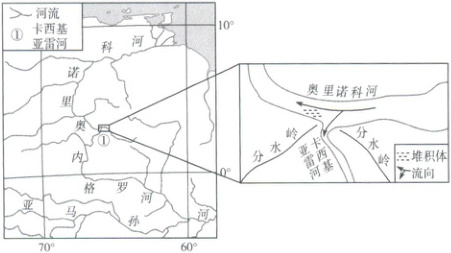 南美洲的卡西基亚雷河(以下简称“卡河”)是奥里诺科河(以下简称“奥河”)上游的一条汊河,经内格罗河流入亚马孙河(如图)。奥河在分汊口附近堆积有大量沉积物。自分汊口向下游方向,相比较而言,奥河河道宽而浅,卡河河道窄而深,卡河河床纵剖面坡度明显大于奥河。目前该分汊口上游约四分之一的来水流入到卡河,专家预测卡河未来将成为主要河道。