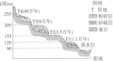 (2024·浙江1月选考)河流阶地是发育在河谷两侧高水位之上的阶梯状台地。下图为某河流阶地剖面示意图,图中标注的时间为阶地形成的距今时间。完成7~8题。