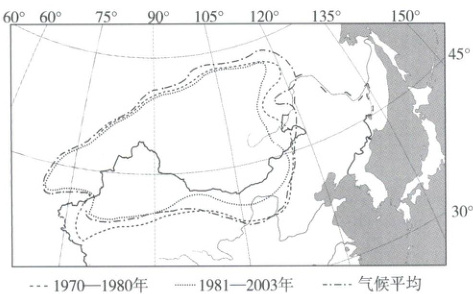 亚洲高压是冬半年盘踞于蒙古—西伯利亚地区对流层下部稳定而强大的冷气团。气象学中一般用1025hPa等压线作为其分布范围的边界线。下图为1970—2003年亚洲1025hPa等压线的位置平均变动示意图。