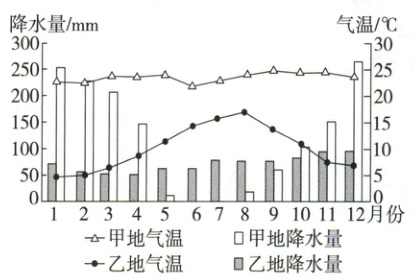 (2025·福建漳州高二期中)下图为甲、乙两地气候资料图。据此完成1~2题。