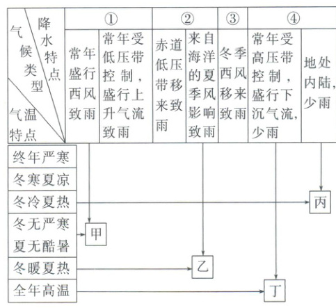 1. 甲、乙、丙、丁四地对应的气候类型是