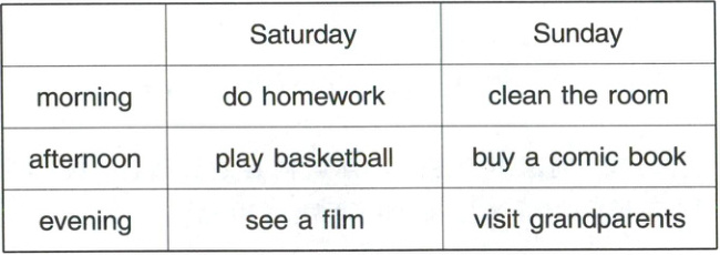 On Saturday afternoon, I'm going to play basketball. On Saturday evening, I'm going to see a film. On Sunday morning, I'm going to clean the room. On Sunday afternoon, I'm going to buy a comic book. On Sunday evening, I'm going to visit grandparents.