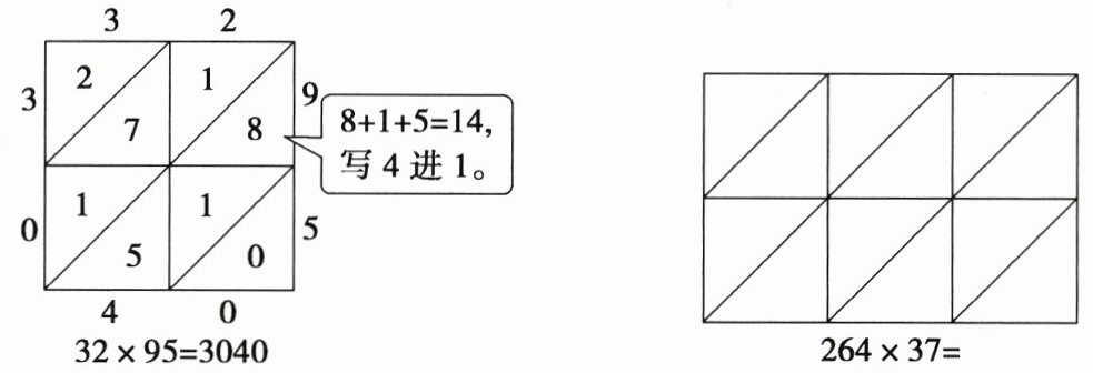 3. 下面是 15 世纪意大利一本算术书中介绍的“格子乘法”。请你照样子算出 264×37 的积。(6 分)