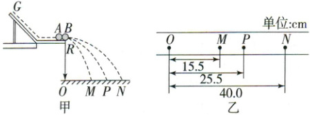 例 1 (2025·江苏淮安市期中)某小组用如图甲所示的“碰撞实验器”来验证两个小球在轨道水平部分碰撞前后的动量守恒定律。图甲中 $O$ 点是小球抛出点在水平地面上的垂直投影。实验时,先让小球 $A$ 多次从斜槽上位置 $G$ 点由静止释放,找到其落点的平均位置 $P$,测量平抛射程 $OP$。然后把小球 $B$ 静置于轨道水平部分末端的位置 $R$ 点,再将小球 $A$ 从斜槽上位置 $G$ 处由静止释放,与小球 $B$ 碰撞,如此重复多次,$M$、$N$ 为两球碰后的平均落点,重力加速度为 $g$,回答下列问题: