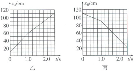 ④导出传感器记录的数据,绘制 $x_A$、$x_B$ 随时间变化的图像,分别如图乙、图丙所示。