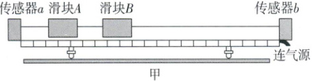 例 2 (2024·山东卷,T13)在第四次“天宫课堂”中,航天员演示了动量守恒实验。受此启发,某同学使用如图甲所示的装置进行了碰撞实验,气垫导轨两端分别安装 $a$、$b$ 两个位移传感器,$a$ 测量滑块 $A$ 与它的距离 $x_A$,$b$ 测量滑块 $B$ 与它的距离 $x_B$。部分实验步骤如下: