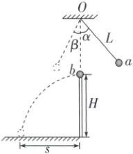 例 3 (2025·重庆万州二中期中)佳佳老师带领 11、12 班的研究学习小组利用如图所示装置,将钢球 $a$ 用细线悬挂于 $O$ 点,钢球 $b$ 放在离地面高度为 $H$ 的支柱上,$O$ 点到 $a$ 球球心的距离为 $L$。将 $a$ 球拉至悬线与竖直方向夹角为 $\alpha$ 的位置,由静止释放后摆到最低点时恰与 $b$ 球正碰,碰撞后 $a$ 球把轻质指针(图中未画出)推移到与竖直方向夹角为 $\beta$ 的位置,$b$ 球水平抛出后落到地面上,测出 $b$ 球的水平位移 $s$。用托盘天平称量出 $a$ 球的质量 $m_a$、$b$ 球的质量 $m_b$,再结合当地重力加速度 $g$,验证了 $a$、$b$ 两钢球碰撞前、后系统动量守恒。