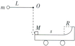 例 5 (2024·安徽卷,T14)如图所示,一实验小车静止在光滑水平面上,其上表面有粗糙水平轨道与光滑四分之一圆弧轨道。圆弧轨道与水平轨道相切于圆弧轨道最低点,一物块静止于小车最左端,一小球用不可伸长的轻质细线悬挂于 O 点正下方,并轻靠在物块左侧。现将细线拉直到水平位置时,静止释放小球,小球运动到最低点时与物块发生弹性碰撞。碰撞后,物块沿着轨道运动,已知细线长 $ L = 1.25 $ m,小球质量 $ m = 0.20 $ kg,物块、小车质量均为 $ M = 0.30 $ kg,小车上的水平轨道长 $ s = 1.0 $ m,圆弧轨道半径 $ R = 0.15 $ m,小球、物块均可视为质点,不计空气阻力,重力加速度 g 取 $ 10 $ m/s^2。