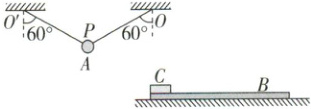 例 4 (2024·甘肃卷,T14) 如图,质量为 $2\ kg$ 的小球 $A$ (视为质点) 在细绳 $O'P$ 和 $OP$ 作用下处于平衡状态,细绳 $O'P = OP = 1.6\ m$,与竖直方向的夹角均为 $60^{\circ}$。质量为 $6\ kg$ 的木板 $B$ 静止在光滑水平面上,质量为 $2\ kg$ 的物块 $C$ 静止在 $B$ 的左端。剪断细绳 $O'P$,小球 $A$ 开始运动。 (重力加速度 $g$ 取 $10\ m/s^{2}$)