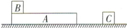 例 3 【教材经典 P30 第 7 题】如图所示,光滑水平轨道上放置长板 $A$ (上表面粗糙) 和滑块 $C$,滑块 $B$ 置于 $A$ 的左端,三者质量分别为 $m_{A} = 2\ kg,m_{B} = 1\ kg,m_{C} = 2\ kg$。开始时 $C$ 静止,$A、B$ 一起以 $v_{0} = 5\ m/s$ 的速度匀速向右运动,$A$ 与 $C$ 发生碰撞 (时间极短) 后 $C$ 向右运动,经过一段时间,$A、B$ 再次达到共同速度一起向右运动,且恰好不再与 $C$ 碰撞。求 $A$ 与 $C$ 发生碰撞后的瞬间 $A$ 的速度大小。