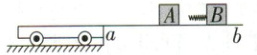 例 5 (2025·山东滨州市期中) 如图,足够长的水平轨道 $ab$ 光滑,在轨道 $ab$ 上放着质量分别为 $m_{A} = 2\ kg、m_{B} = 1\ kg$ 的物块 $A、B$ (均可视为质点),$B$ 的左端水平拴接一条轻质弹簧。轨道左侧的光滑水平地面上停着一质量 $M = 2\ kg$、长 $L = 0.5\ m$ 的小车,小车上表面与 $ab$ 等高,现让 $B$ 物块以 $v_{0} = 3\ m/s$ 的初速度向左运动。已知 $A$ 滑上小车前已经与弹簧分离,弹簧的形变始终在弹性限度内,$A$ 与小车之间的动摩擦因数 $\mu = 0.3,g$ 取 $10\ m/s^{2}$,求: