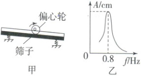 (多选)(2025·安徽黄山市模拟)把一个筛子用四根弹簧支撑起来,筛子上装一个电动偏心轮,它每转一周,给筛子一个驱动力,这就做成了一个共振筛,如图甲所示。该共振筛的共振曲线如图乙所示。已知增大电压,可使偏心轮转速提高;增加弹簧的劲度系数,可减小筛子的固有周期。现在,在某电压下偏心轮的转速是60 r/min。为使共振筛的振幅增大,以下做法可行的是(