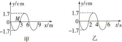 1. (振动图像和波的图像) (2025·河北邯郸市期中) “地震预警” 指在地震发生以后,抢在地震波传播到受灾地区前,向受灾地区提前几秒至数十秒发出警报,通知目标区域从而实现预警。科研机构对波的特性展开研究,如图甲所示为研究过程中一列沿 $ x $ 轴传播的简谐横波在 $ t = 0 $ 时刻的波形图,$ x = 3m $ 处的质点 $ M $ 的振动图像如图乙所示。下列说法正确的是 (