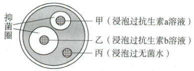 3. 为探究两种抗生素对某细菌的抑制效果,设计如图所示实验方案:在无菌固体培养基表面涂抹被检测细菌,放置甲、乙和丙三个圆形滤纸片(抗生素可在培养基中扩散,滤纸片周围出现抑菌圈的大小能反映其抑菌效果)。下列说法错误的是(