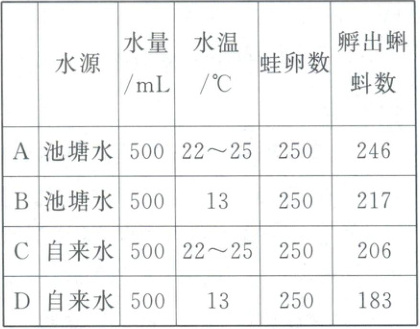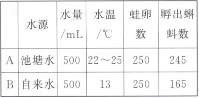 (1)水温和水源的问题 (2)①水温对蛙卵的孵化具有重要影响,温度较高,孵化率高 ②水质对蛙卵的孵化也具有重要影响,池塘水促进孵化 ③水温和水源是影响蛙卵孵化的重要因素 (3)表2
