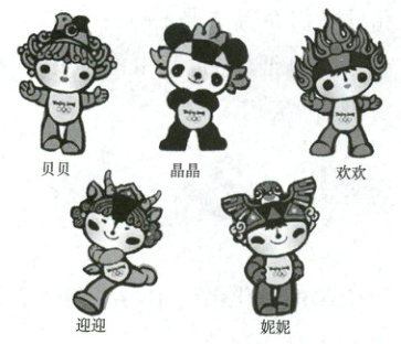 下图是北京第 29 届奥运会的吉祥物“福娃”,它们的造型融入了鱼、大熊猫、藏羚羊、燕子以及奥运圣火的形象。