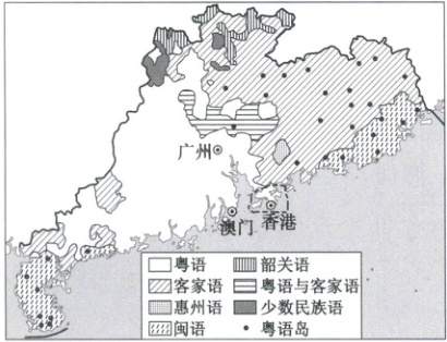 (1)由图可知,广东省方言主要有粤语、客家话、惠州话、闽语、韶关语、少数民族语等,方言类型复杂,空间差异大,以粤语、客家话为主。粤语主要分布在广州以西,客家话主要分布在广东东部,闽语主要分布在粤东南沿海、雷州半岛;非粤语区存在诸多“粤语岛”。
