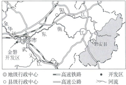 (1)根据材料信息可知,金华市设置金磐开发区产业飞地,经济收益归磐安县所有,能够为磐安县实施“生态立县”发展战略提供资金;磐安县位于大盘山区,生态环境质量较高,为重点生态功能区,适宜发展生态农业、生态旅游等生态经济;磐安县位于浙江省,距离我国东部上海等经济发达地区较近,靠近生态旅游客源地,靠近高速公路和高铁,交通运输条件便利,适宜发展生态旅游产业。