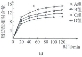 ④ 向各组分别加入20mL人工肠消化液,充分搅拌。37℃下反应2小时,每隔20分钟测量脂肪酸相对含量。每组实验重复3次,取实验数据的平均值。结果如图甲所示。