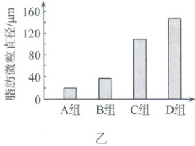 (4) 为什么魔芋膳食纤维能抑制脂肪的分解?研究人员作出假设:魔芋膳食纤维可以使分散的脂肪微粒聚集,减少脂肪与酶的接触面积。接着,他们测量了上述实验完成时每组烧杯中脂肪微粒的直径,结果如图乙所示。由此推测,魔芋膳食纤维可能与人体的