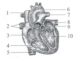 (1)10左心室 6主动脉 (2)房室瓣 动脉瓣 (3)左心房 8肺静脉 右心房 1上腔静脉 5下腔静脉