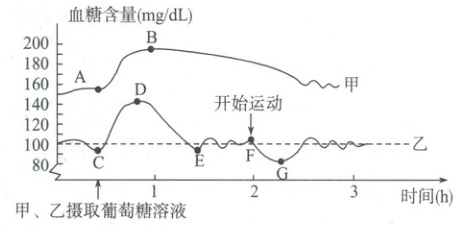 2. (2023·菏泽)图中甲、乙分别为糖尿病患者和健康人的血糖含量变化曲线,据图分析错误的是(