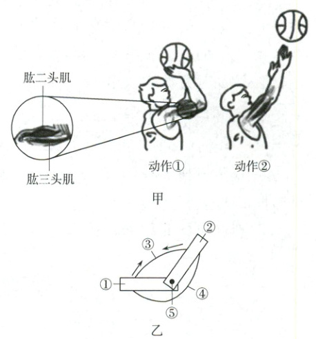 )A.图甲中动作①到动作②的过程,肱二头肌收缩、肱三头肌舒张
