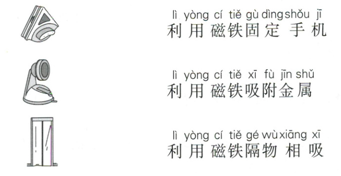 从上至下依次为A(利用磁铁固定手机对应的图连线)、B(利用磁铁吸附金属对应的图连线)、C(利用磁铁隔物相吸对应的图连线 ,此处假设三个图选项依次为A、B、C)