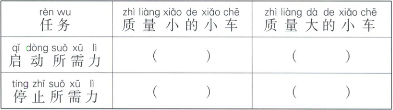 让质量不同的小车动起来与停下来,用力有什么不同?请完成表格。