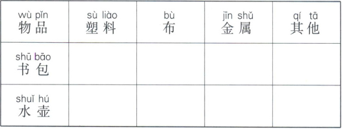 五、仿照课本“文具盒和文具所用材料调查表”,统计你书包里的物品材料,完成表格并回答问题。