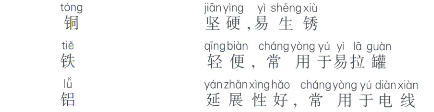 铜—延展性好,常用于电线;铁—坚硬,易生锈;铝—轻便,常用于易拉罐