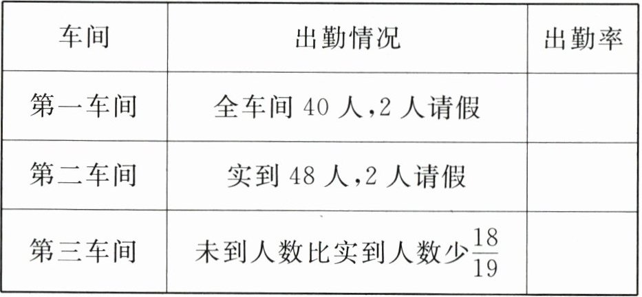 第一、二、三车间的出勤率分别是:(40-2)÷40 = 95%,48 ÷(48 + 2)= 96%,1÷$(1+1-\frac{18}{19})$=95%,因此,要表扬第二车间。