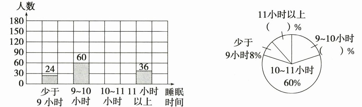 3. 充足的睡眠能保证新陈代谢的顺利进行,促使生长激素正常分泌,是保证学习效率高的重要因素。小学生每天睡眠时间应达到10小时,初中生应达到9小时,高中生应达到8小时。为了解学生的睡眠情况,新华小学对六年级学生进行了调查,并根据调查数据制作了条形统计图和扇形统计图。(11分)